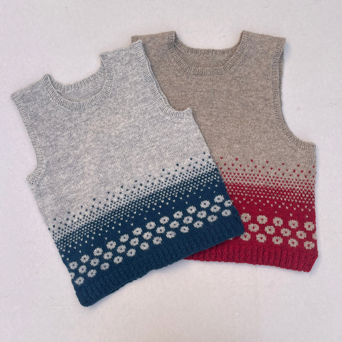 This vest is initially knitted separately for the waistband, then joined in the round to work upwards, every round knit, each round starts at the left side. The hem uses a mock cable rib (instructions given in the abbreviations), while the neck and sleeve bands use a (k1, p1) rib. It's intended to have approximately 7.5cm (3in) positive ease through the body, which should leave enough room for another underlying layer. The vest is a boxy design with two side slits to give plenty of room for hips and waistbands to sit comfortably underneath.
